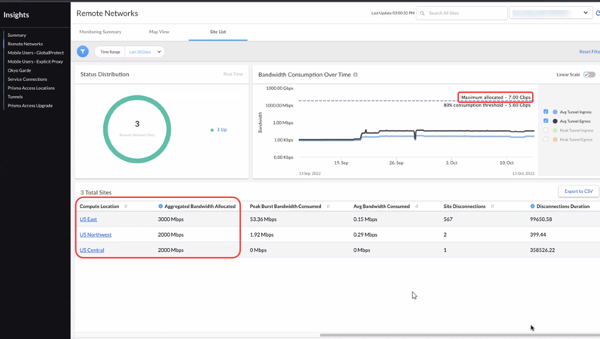 You can view the remote network bandwidth allocated per compute location in the Total Sites table using the rn_bandwidth_allocated resource.